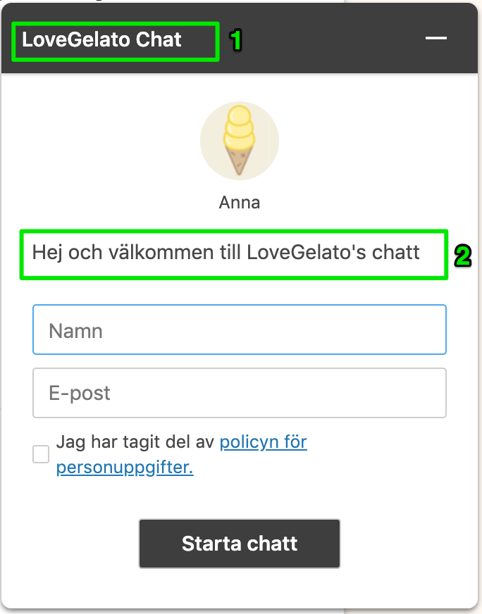 Teksten som synes enten når den besøkende har klikket på chatteknappen eller når chatten popper opp automatisk. Se bilde nr.2 i eksempelet nedenfor.
